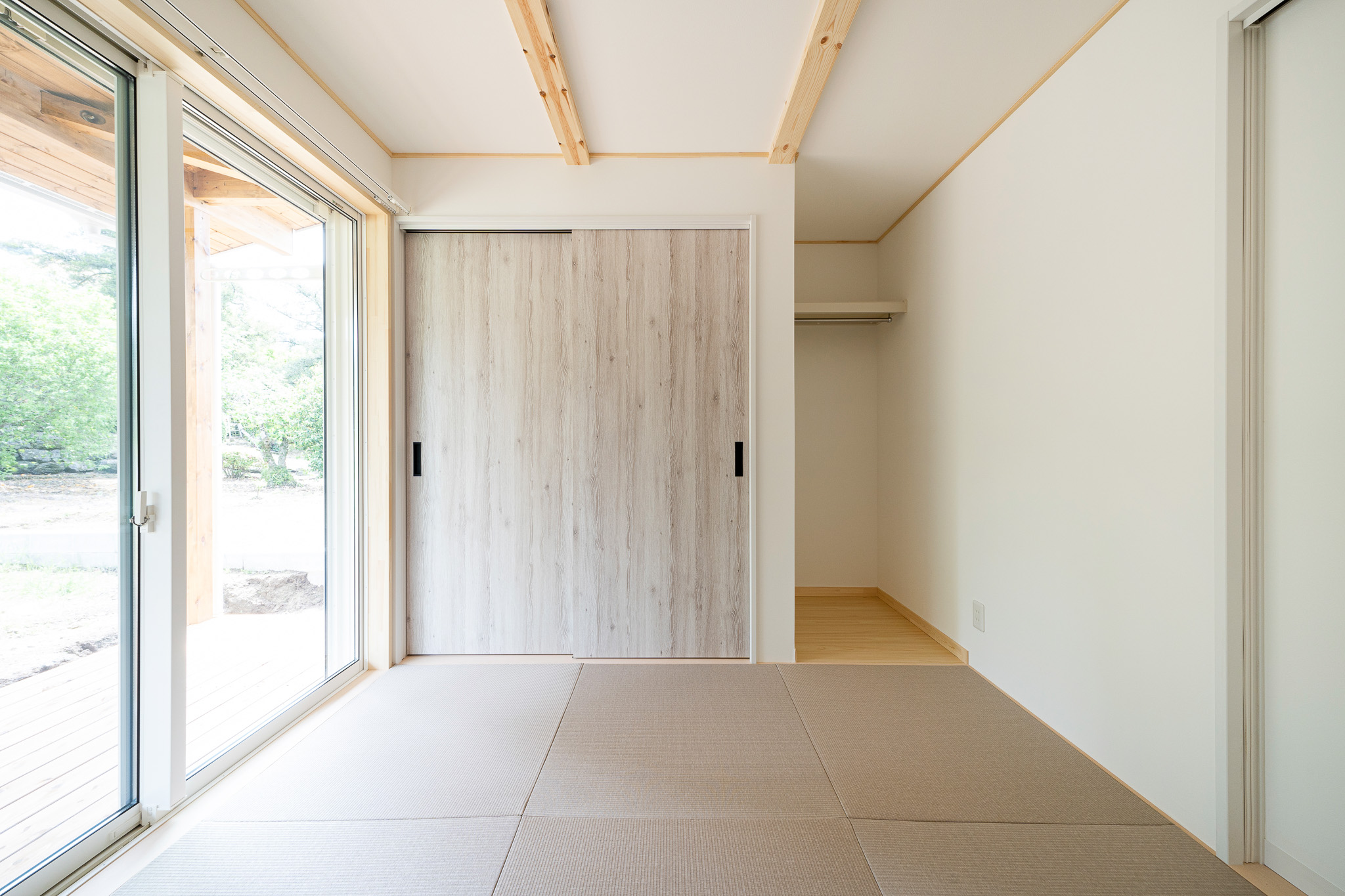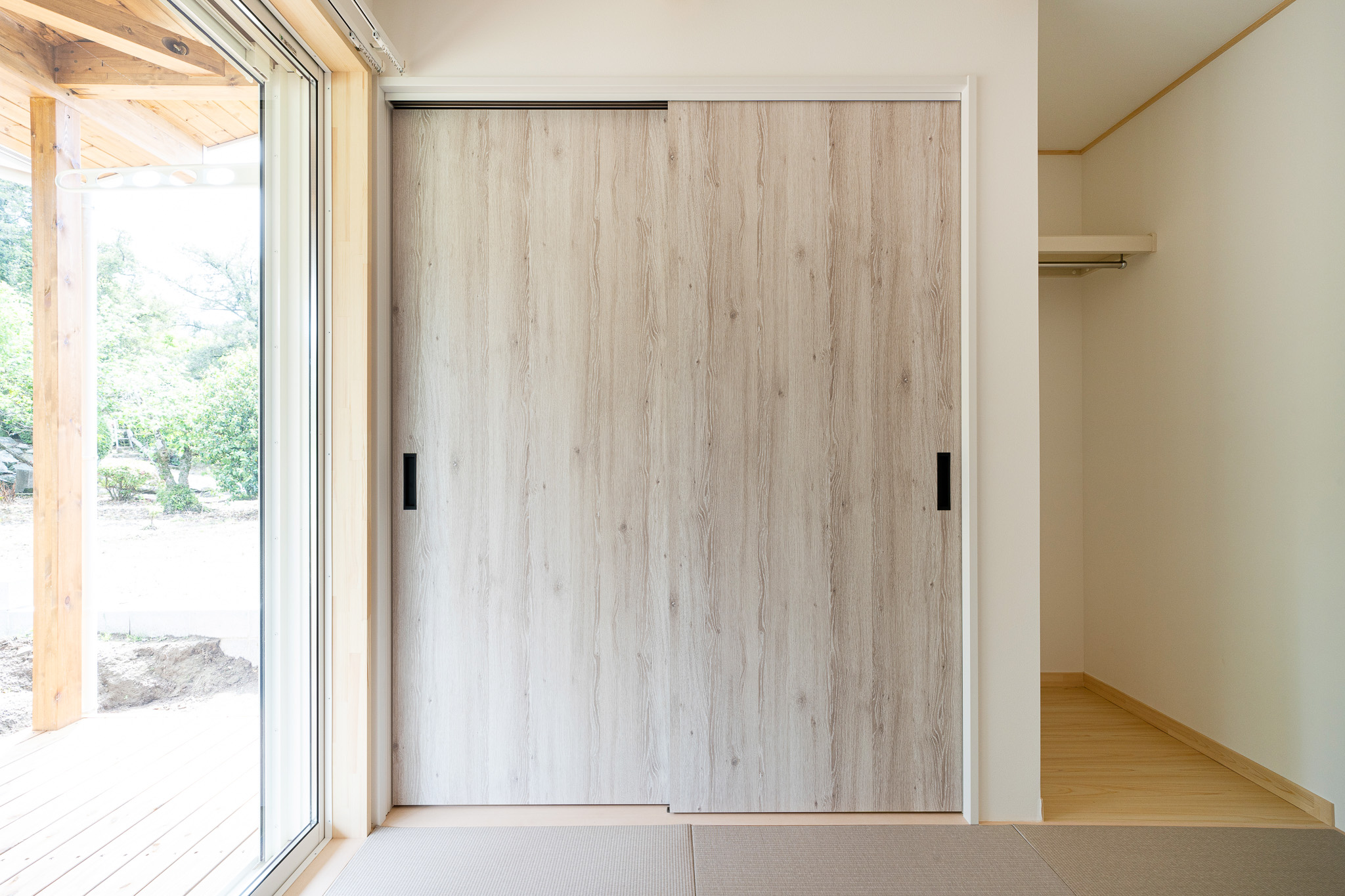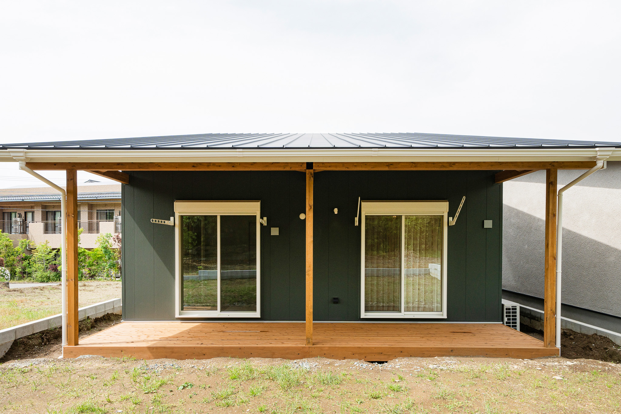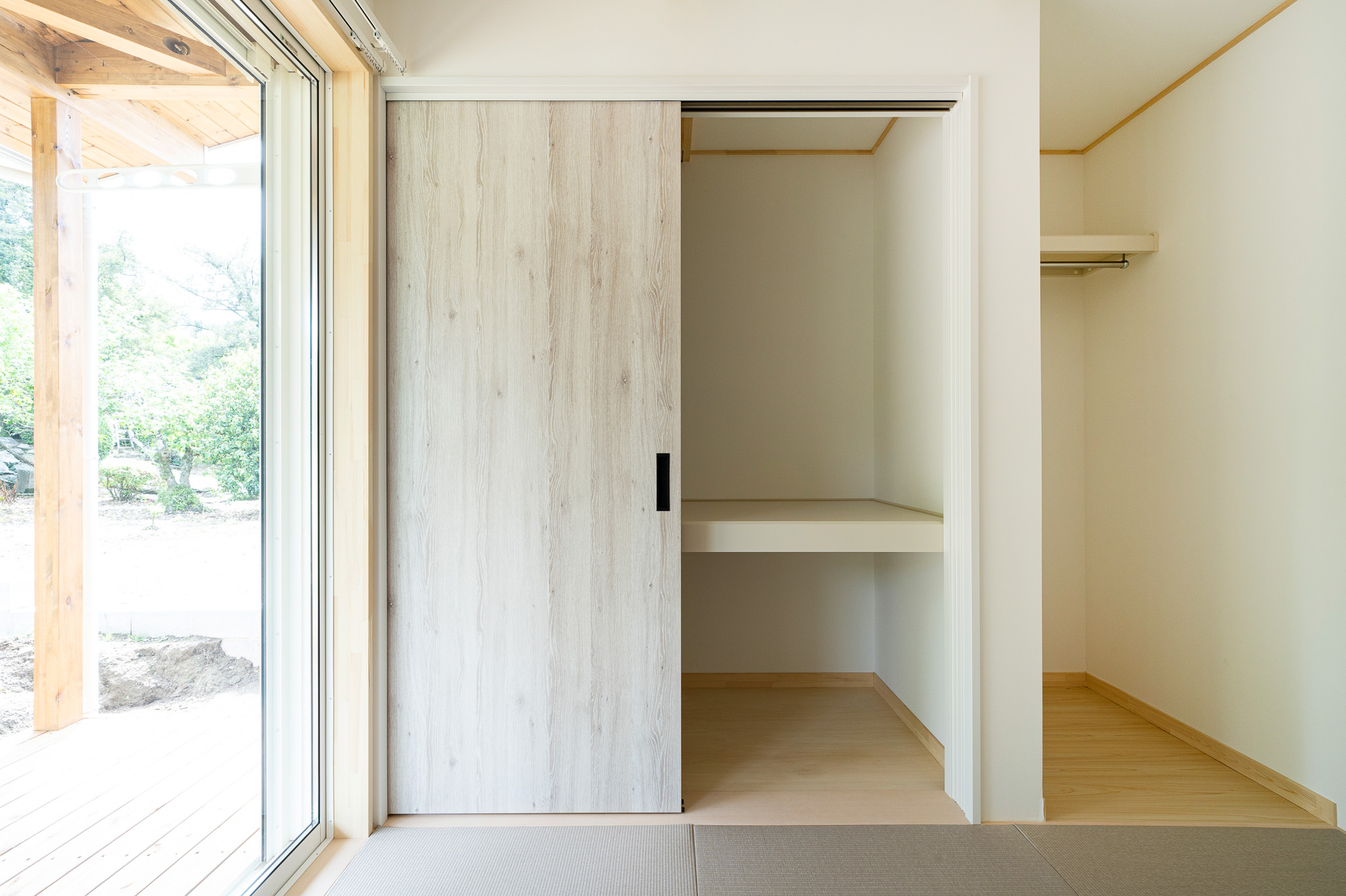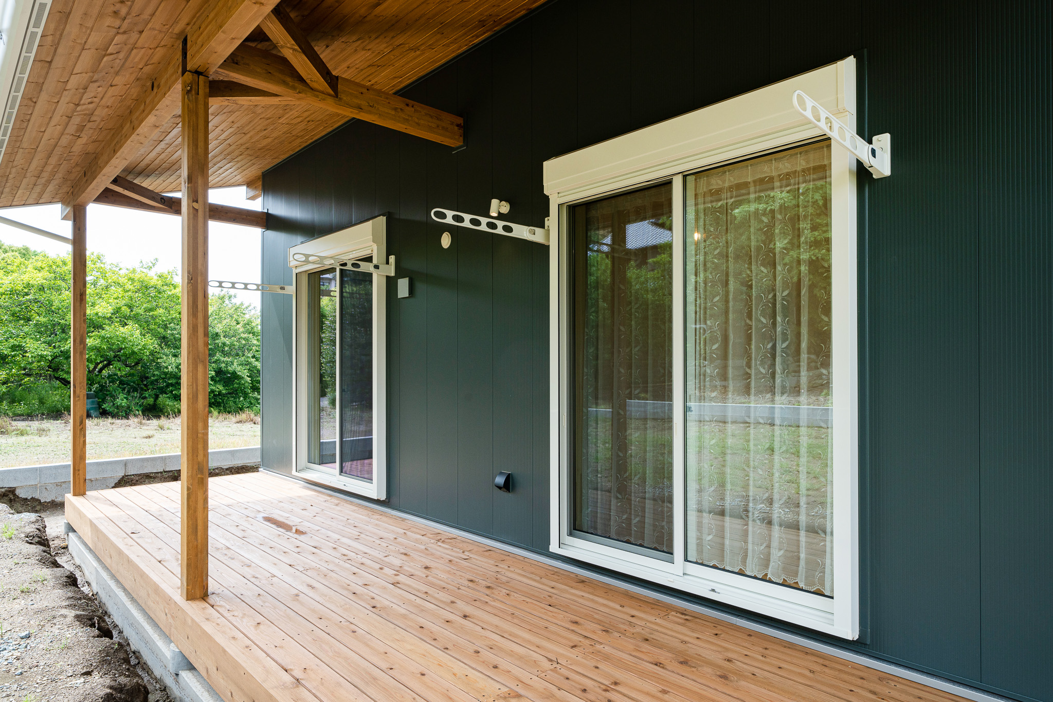 裏手には、リビングと和室の両方から行き来できる広々としたウッドデッキを設け、洗濯スペースとしても、家族や友人と過ごす団欒の場所としても活躍します。