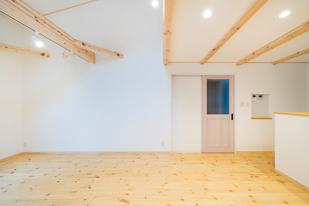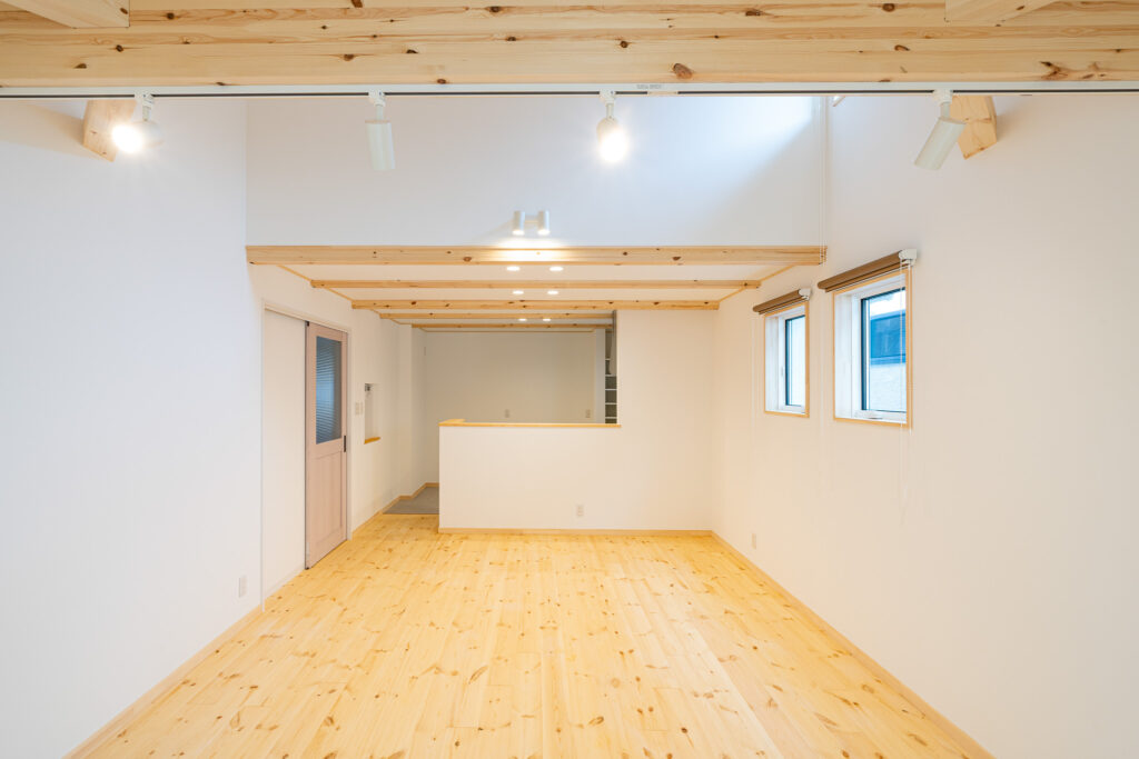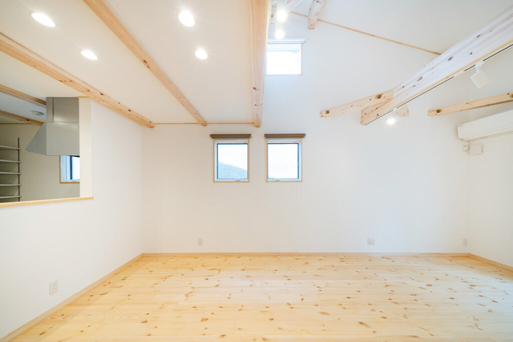 屋根形状を活かした高天井が、空間に広がりとゆとりを生み出します。