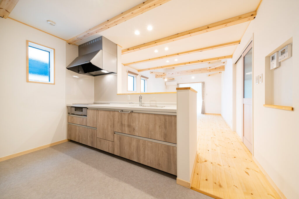 キッチンはリビング側から見えにくい設計で、生活感を抑えた上質な雰囲気に。