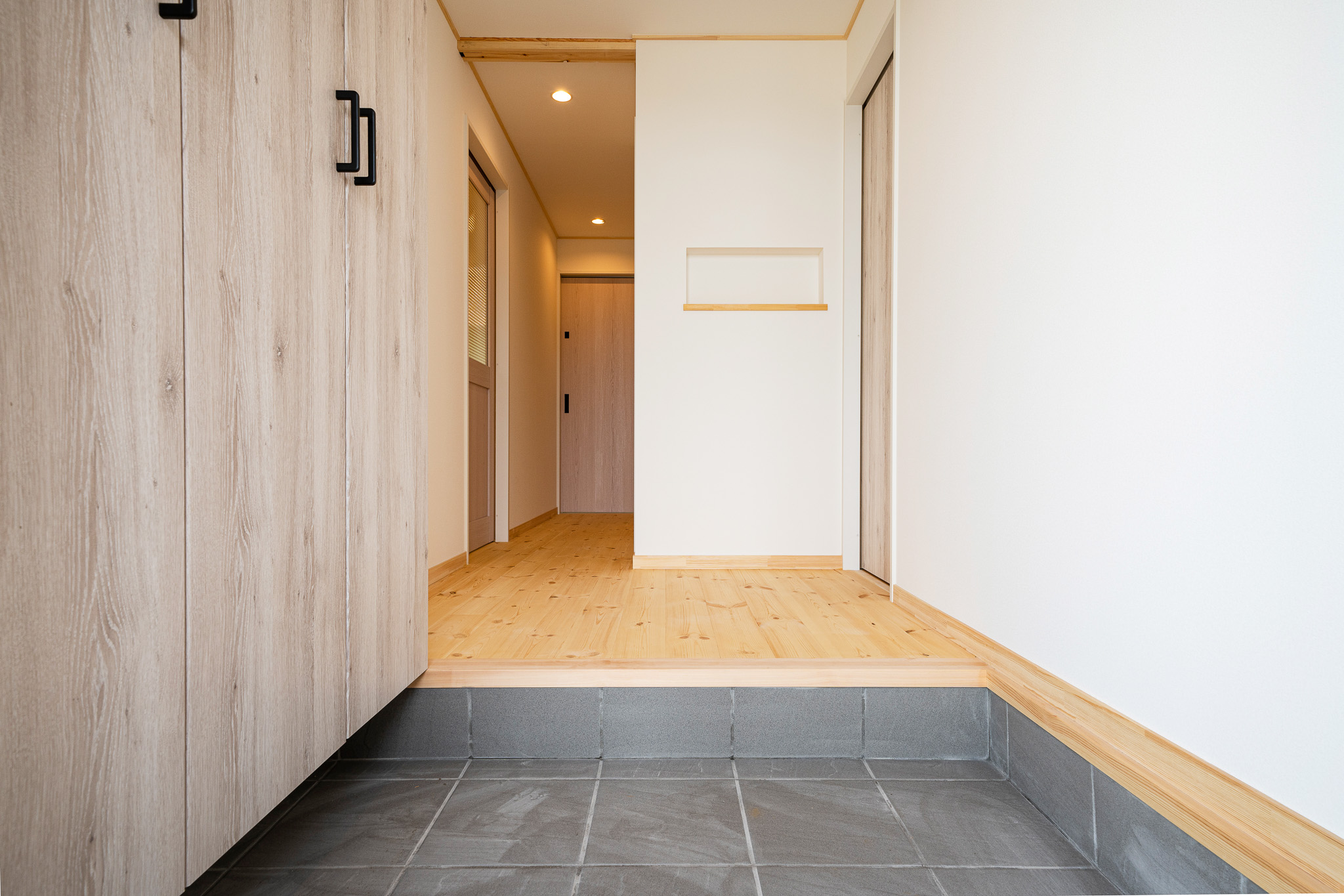 玄関横に設けたアウトサイドストッカーは、アウトドア用品や日用品をすっきり収納できる頼もしい空間。玄関を美しく保ちながら、出し入れもスムーズに。