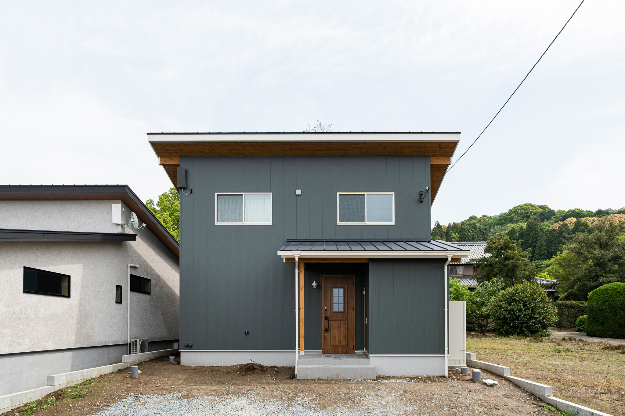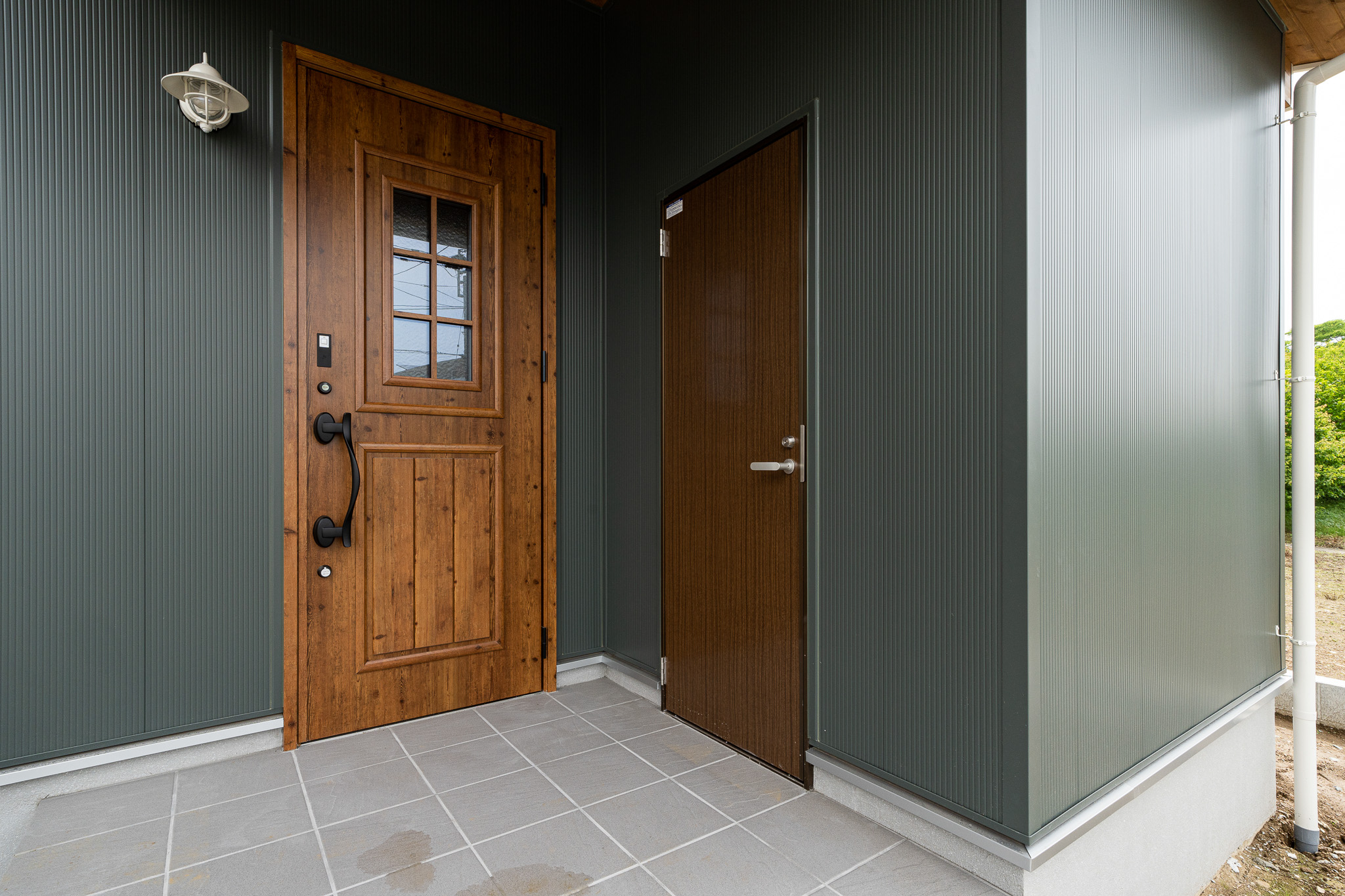 陰影の美しいモスグリーンの外壁に包まれた、落ち着きのある佇まい。